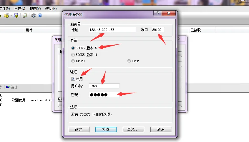 proxifier 使用帮助 1. 解压安装 2. 选择配置文件,代理服务器 3. 选择添加服务器 4. 填写正确的代理信息 ,注意选择开通正确的协议信息 sk5或http 选择对应 . 如需检查代理是否正常 点击检查 5. 确定保存即可实现pc换ip 检测地址 www.ip138.com 6.配置文件—代理规则那里 尽量勿动, 默认全局修改。
